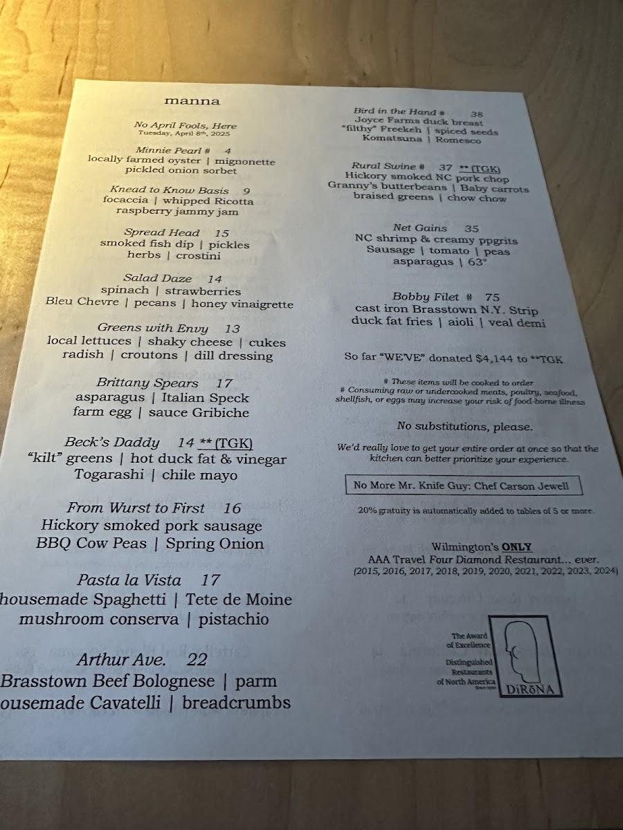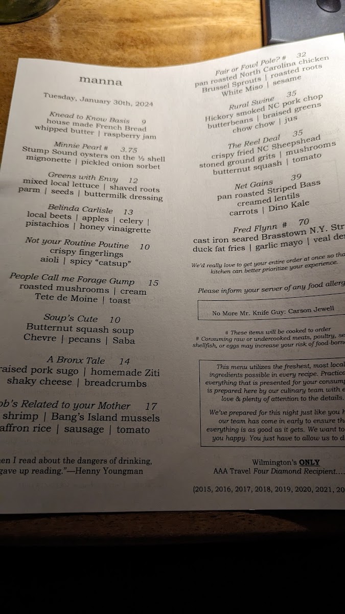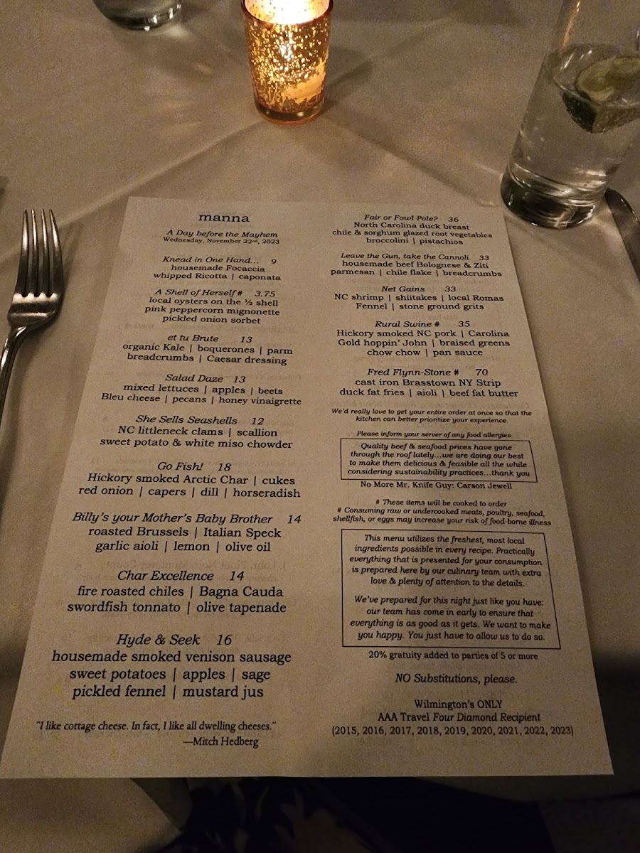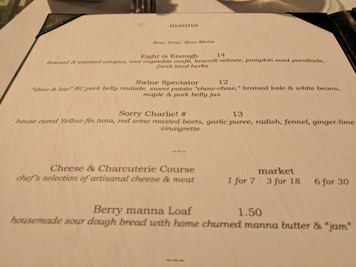 manna "slow & low" Carolina Heritage Farms pork belly "du jour," heirloom white sweet potato puree, charred & glazed Cipollini onions, jalapeno, turnip & fennel chow chow